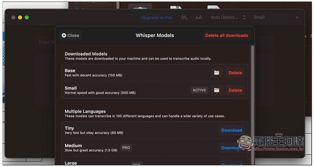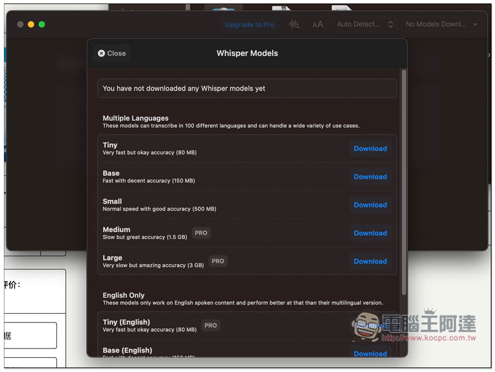 接著選擇你要下載使用的模型,上方是支援多國語言(Multiple Languages),包括繁體中文,下方則是只有英文(English Only),而免費用戶的多國語言只能使用 Tiny、Base 和 Small,Small 的準確度最高但速度適中,不是最快,這我是覺得還好,我測試 15 分鐘左右的影片,大概 1 分 10 秒就完成,還可以接受: