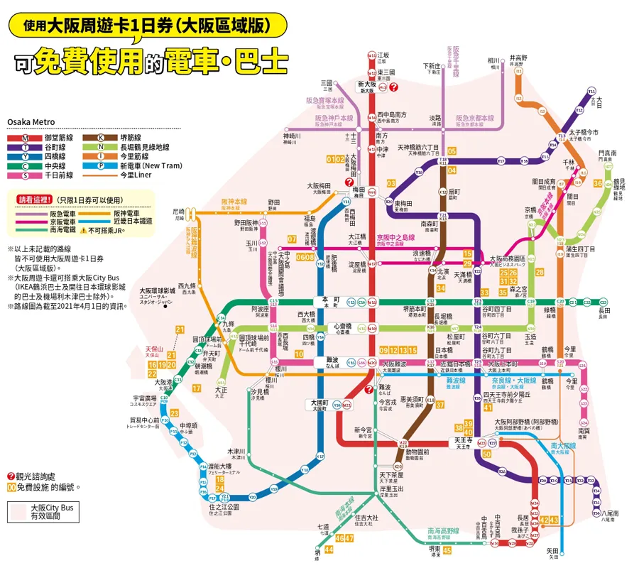 ▲ 圖4:大阪周遊券 2 日券地鐵圖/出自大阪周遊券官方網站