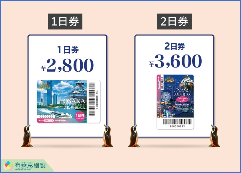 大阪周遊券依照使用日期分為 2 種票種,1 日券和 2 日券。這張票券只有一種的售價,沒有兒童的優惠價格,能夠享受的設施都是一樣的。
