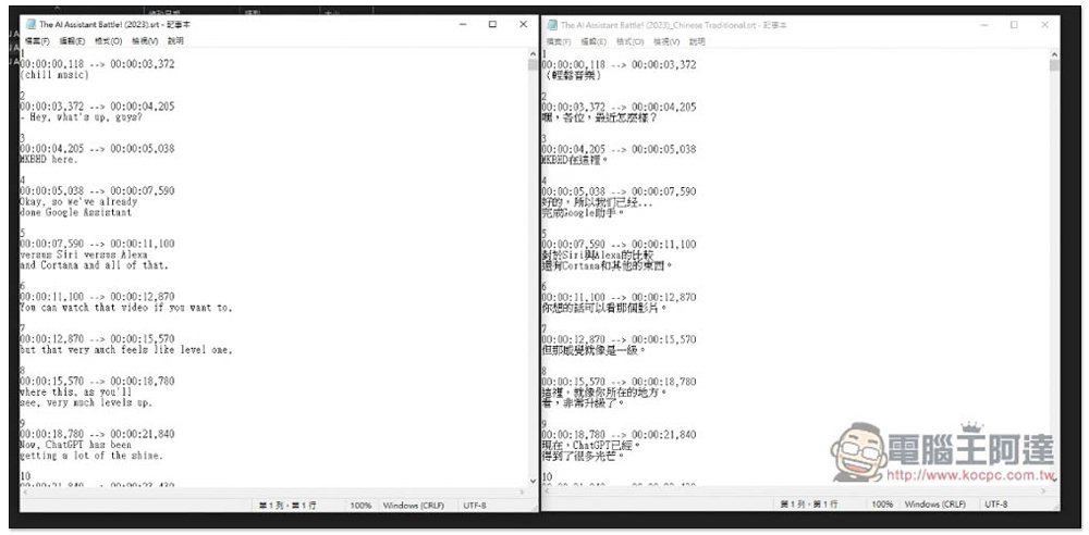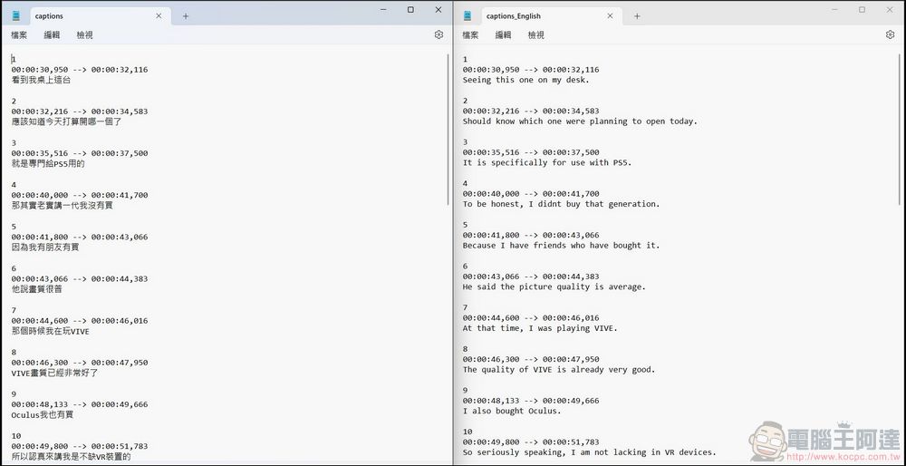 字幕檔的時間戳都會保留下載,然後把原本英文內容翻成中文,翻譯品質相當不錯,真的讚: