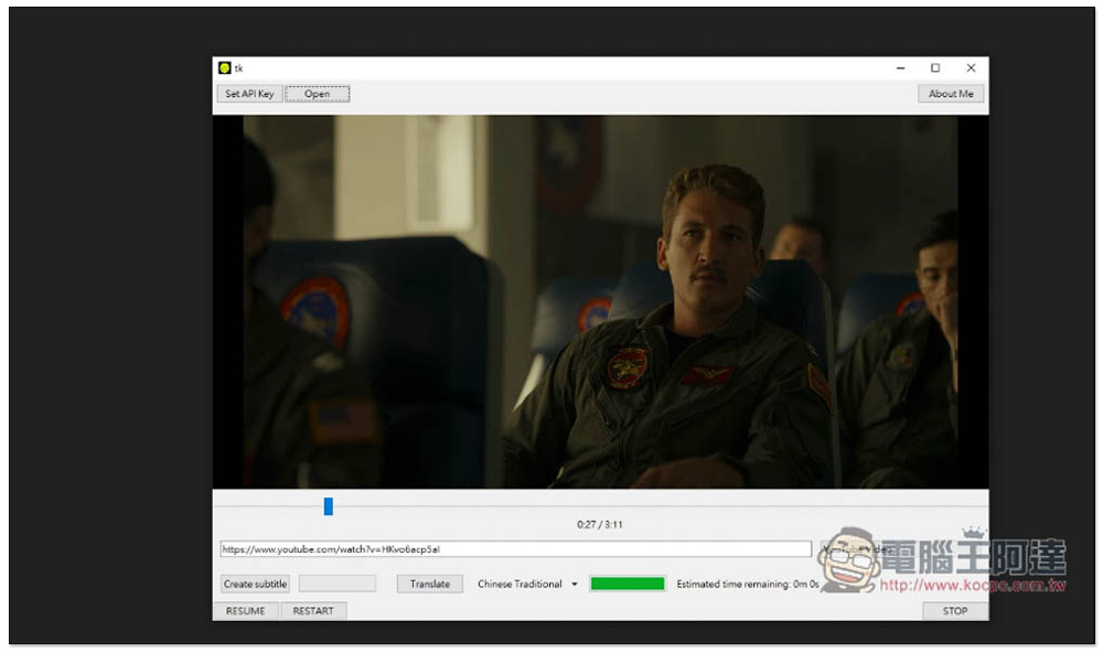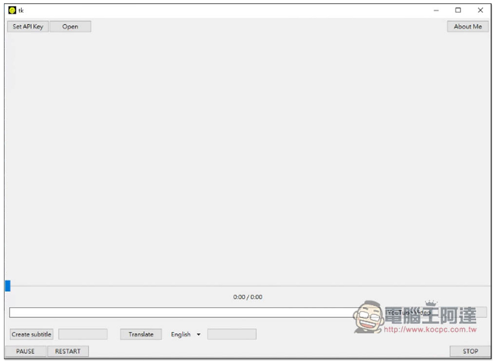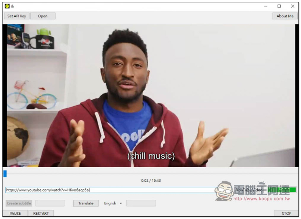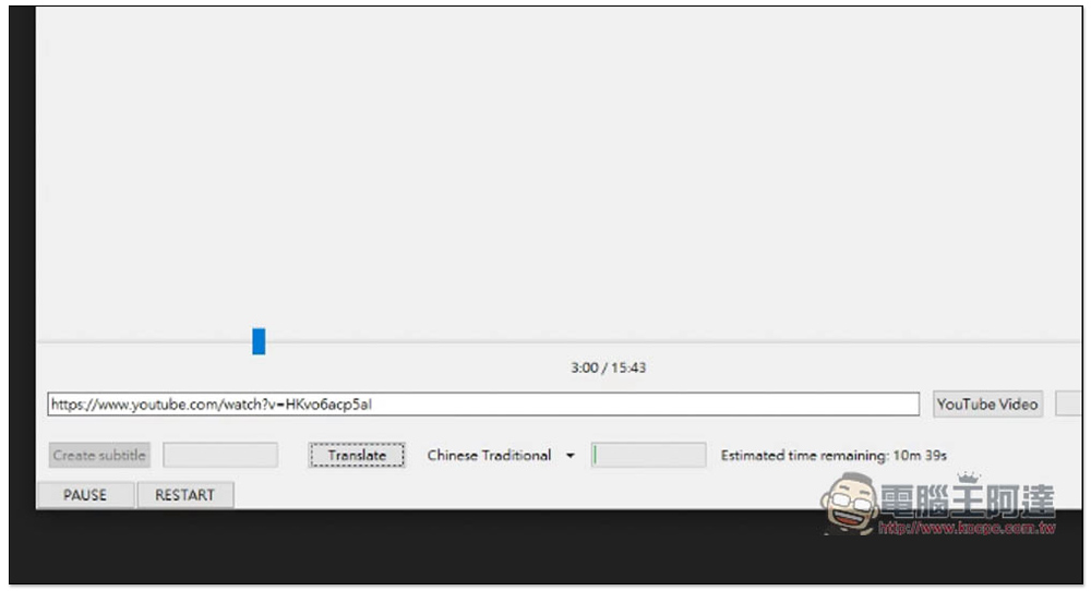 YouTube 部分它會自動判斷來源有沒有字幕檔,如果有,會一併下載和啟用字幕。中間滑桿可調整播放位置,如果要暫停播放,請按左下角的 PAUSE,右下角 STOP 是停止播放: