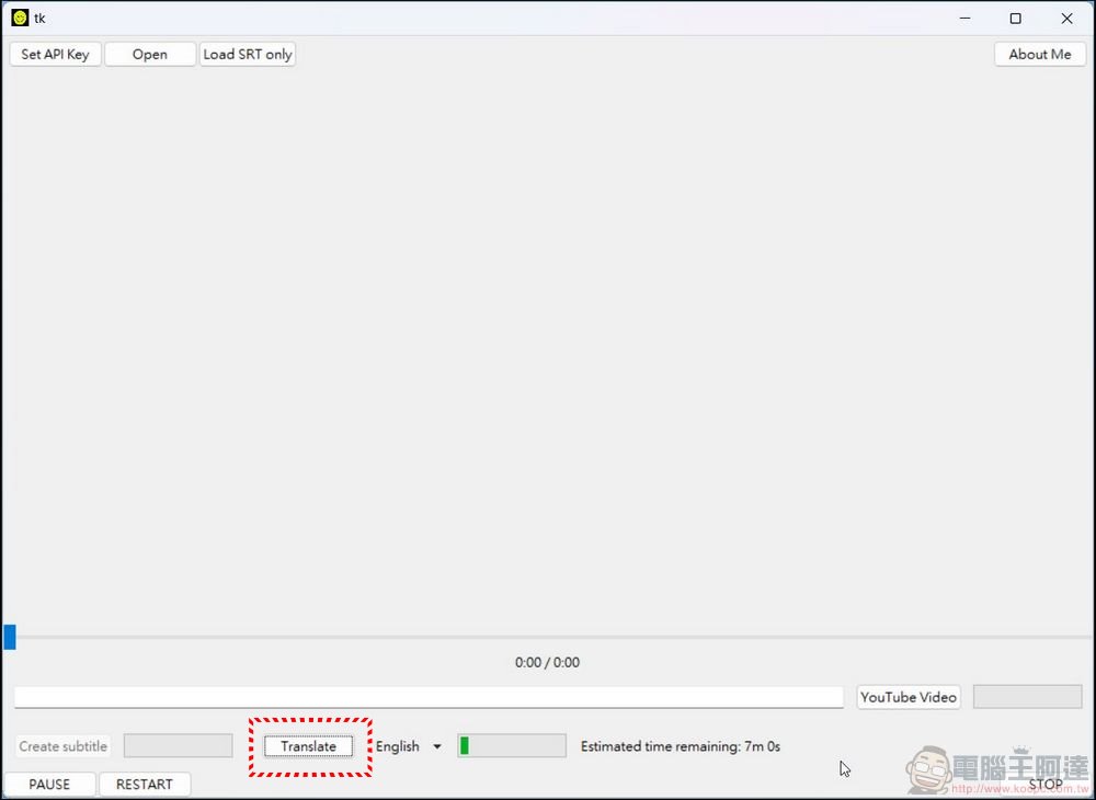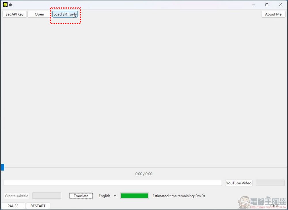 這兩天作者加入新功能,可以直接單獨上傳現成的 SRT 檔讓 CHATGPT 翻譯(當然還是要有API KEY),點擊OPEN旁邊的 LOAD SRT ONLY,並選擇要翻譯的字幕檔: