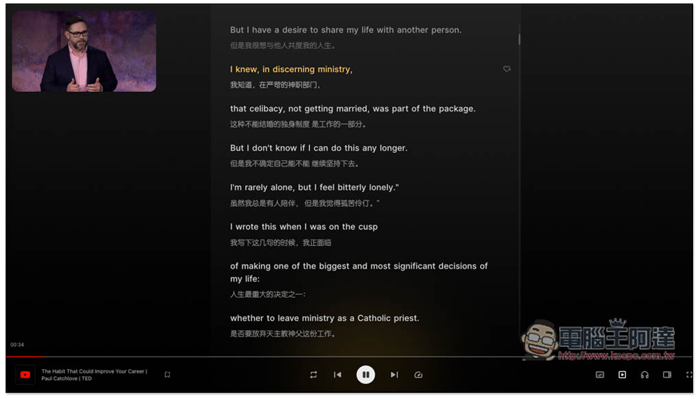 它會把 YouTube 縮小放置在左上角,中間顯示雙字幕(我設定學習英文和中文,所以就顯示這兩個語言字幕),影片講到哪一段都會用黃色標示: