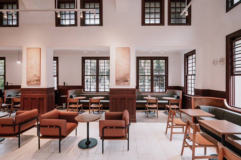 為增添整座古蹟建物的氛圍,大量運用落地燈與盆栽元素作點綴。幾乎每間星巴克都存在,貫穿整間門市的室內Artwork部分,則描繪出新竹的風吹拂過建物、樹林、溪水,整個城市,每張圖都是一張城市最美麗的風景。