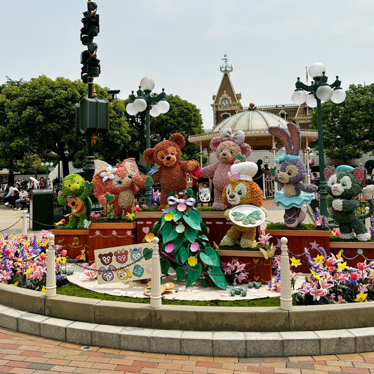 繼續往樂園內走到美國小鎮大街,達菲與好友主題花卉裝飾也是粉絲們必到打卡之處,每隻角色都做得惟妙惟肖,絕對讓人直呼「太可愛啦!」也請各位粉絲注意,由於要拍照的人潮相當多,通常會需要花一些時間排隊拍照,但真的很值得!