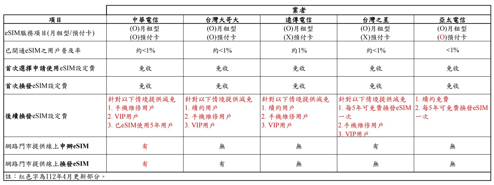 各家電信業者四月份起針對eSIM服務申請與收費方式有哪些變更呢? 以下作一整理: