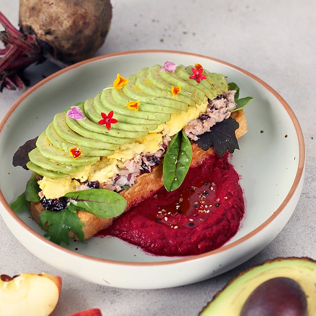 愛吃酪梨的女孩千萬不能錯過這道蛋白質滿點的「酪梨沙拉鮪魚開面吐司」,一入眼就是巨~多~的新鮮酪梨,中間夾著秘製的鮪魚餡(這真的是蔬食!)與新鮮蔬菜,畫龍點睛的搭配紅色的甜菜根豆泥增添清爽層次風味,一早就要你吃得超滿足!