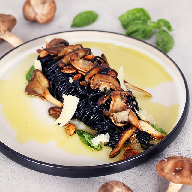 一上桌立刻聞到滿滿野菇松露味~瞬間引爆味蕾、忍不住開動!蒜油拌炒到金黃焦香的野菇舖在自製的Q彈竹炭麵上,簡單卻有著豐富層次的美味,女孩們千萬別錯過!