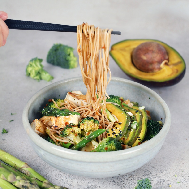 使用花椰菜、毛豆、豆腐、酪梨製成的「芝麻薑醋全能量蔬菜蕎麥麵」,有滿滿的蛋白質,把芝麻醋醬拌勻在蕎麥麵中,吃在口中十分到位!