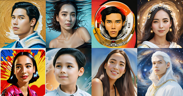 16種男女款式的AI虛擬人像包含現代時尚感的普普風(POP Style)、前衛科幻感的太空人風(Astronaut Style),色彩鮮明宛如手繪質感的油畫風(Oil Painting)、展現古典男神魅力的神話風(God Style),以及運用 AI 科技實現虛擬化身在童稚化臉孔趣味轉換的動畫風(Animation Style)等等。