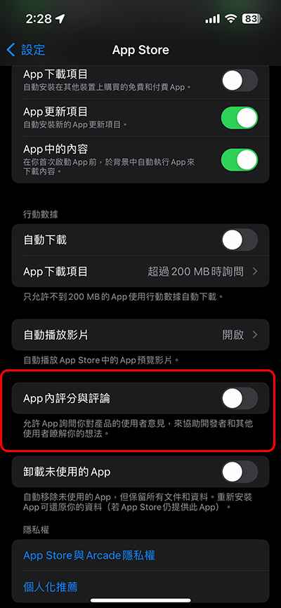 - 往下捲動,將「APP 內評分與評論」這項關掉即可。