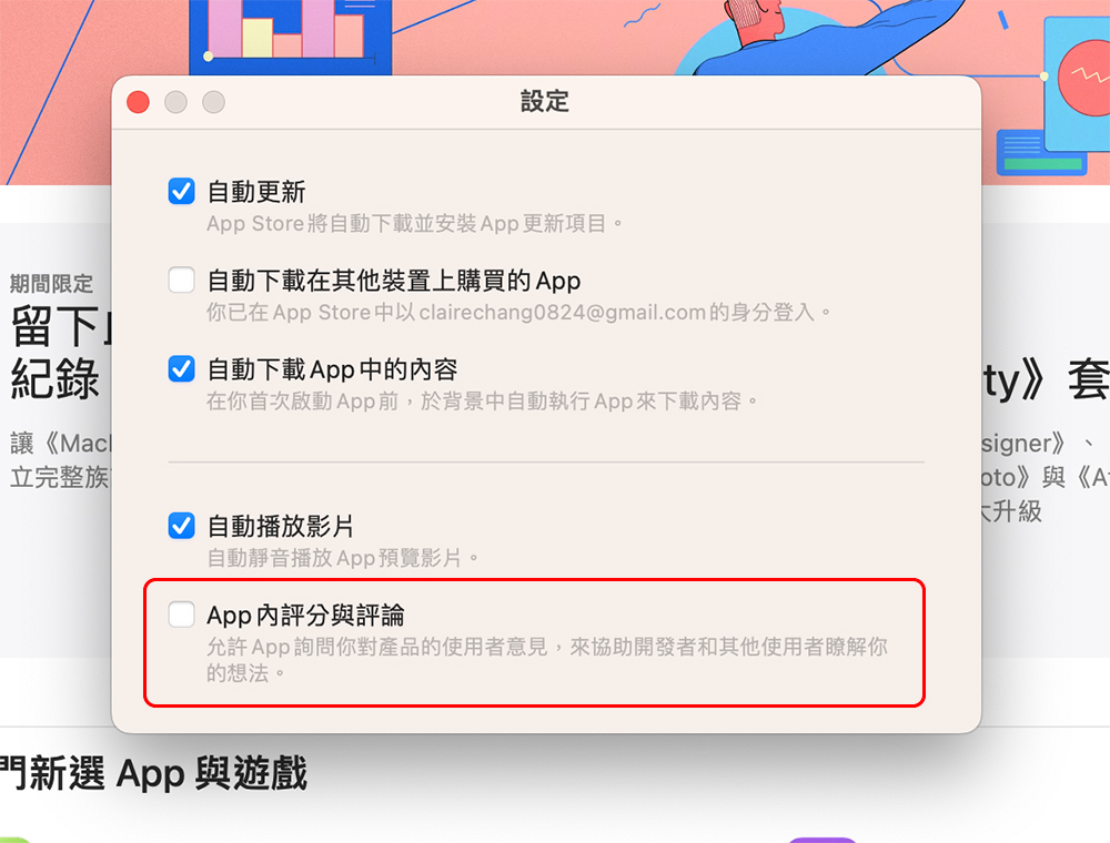 - 將 「App 內評分與評論」這一項的勾勾取消即可。