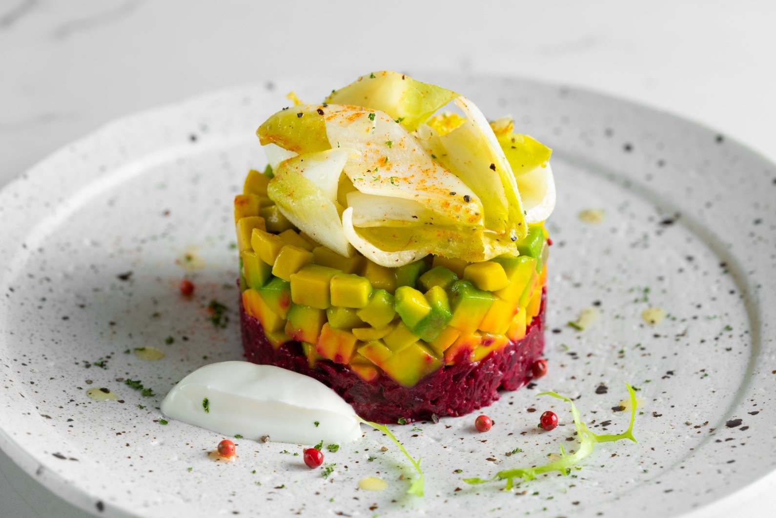光是一上來的繽紛顏色就讓人口水直流,新鮮的菊苣葉片清爽好入口,鮮脆口感與下面的滑順酪梨和甜菜根一起品嚐,瞬間讓味道的豐富層次在口中綻放,絕對是讓人驚豔的必點餐點。