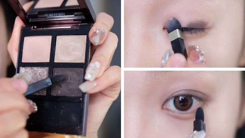 在顏色方面,並非純粹的黑灰色調,而是使用大面積的啞光淺棕色鋪平在上眼,眼尾再疊加黑色。下眼影則貼著眼瞼,用深色眼影掃過。