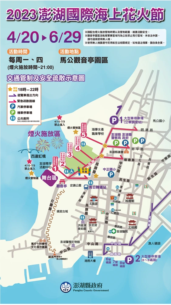 活動主場在澎湖觀音亭,這邊到時候會是行人徒步區,管制時間是 18:00 到 22:00。騎機車或是開車過來的朋友,可以參考下面這張交通管制及疏善示意圖。