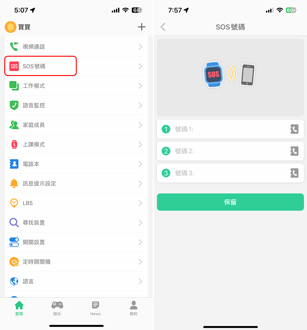 上面我們提到 Thunder 雷電兒童智慧錶上有 SOS 緊急按鈕直接撥話給家長設定的緊急聯絡人。緊急聯絡人的設定就是從這個 SOS 號碼功能中進行設定,裡面最多設定三筆電話號碼,讓孩子遇到臨時狀況時可以有更多求援方案。