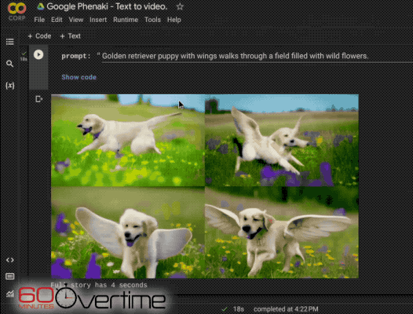 以官方的示範「Golden retriever puppy with wings walks through a field filled with wild flowers.(有著翅膀黃金獵犬寶寶,穿梭於野花盛開的田野。)」來看,其所產生的影片雖然多少可以看到小狗的臉部似乎有些奇妙的變形,不過相對來說與目前硬用圖片生成服務來一格一格製成影片的結果來說,Google Phenaki 至少在背景方面的呈現算是相對穩定。