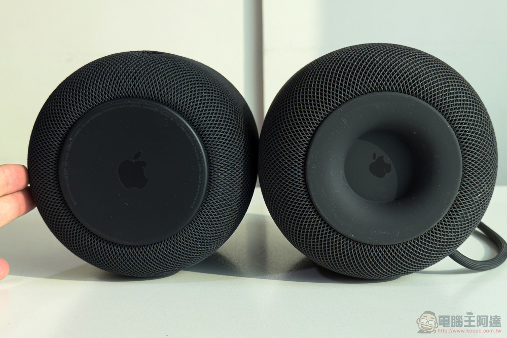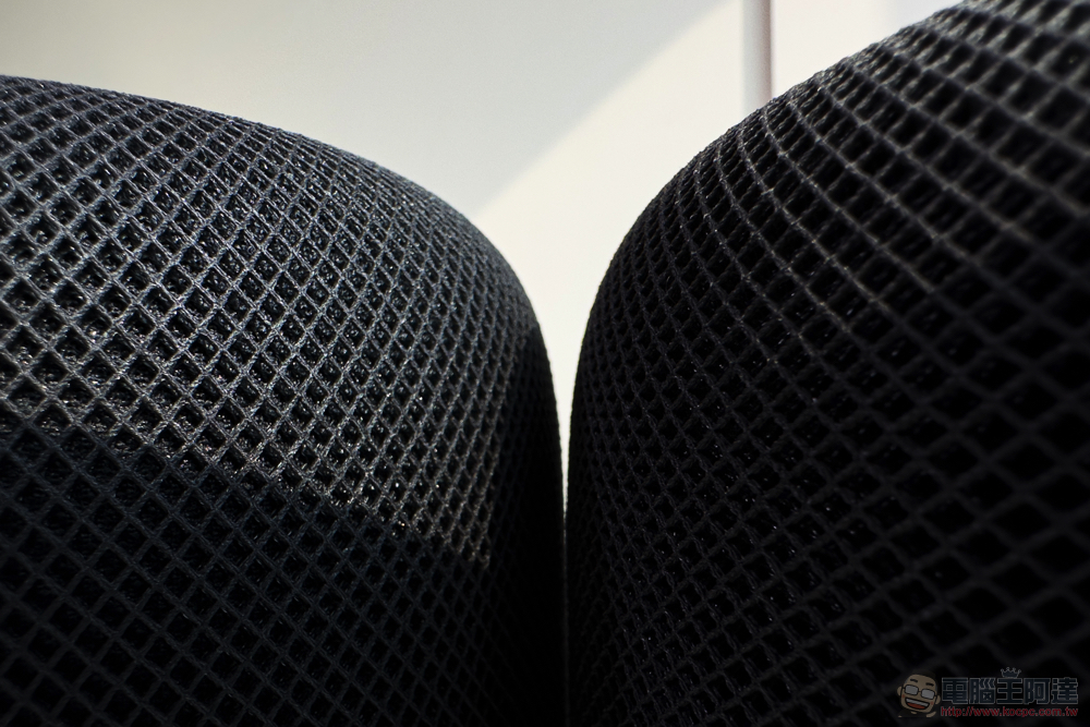 黑色版 HomePod 2 所採用的 100 %(PS:白色版本為 30%)再生塑膠的織物,在網格形狀及顏色上都與前代有著一點點差異 - 雖然會有點懷疑是不是 HomePod 1 沾到太多灰塵而比較灰一點。(PS:上下圖的左側產品都是 HomePod 2)