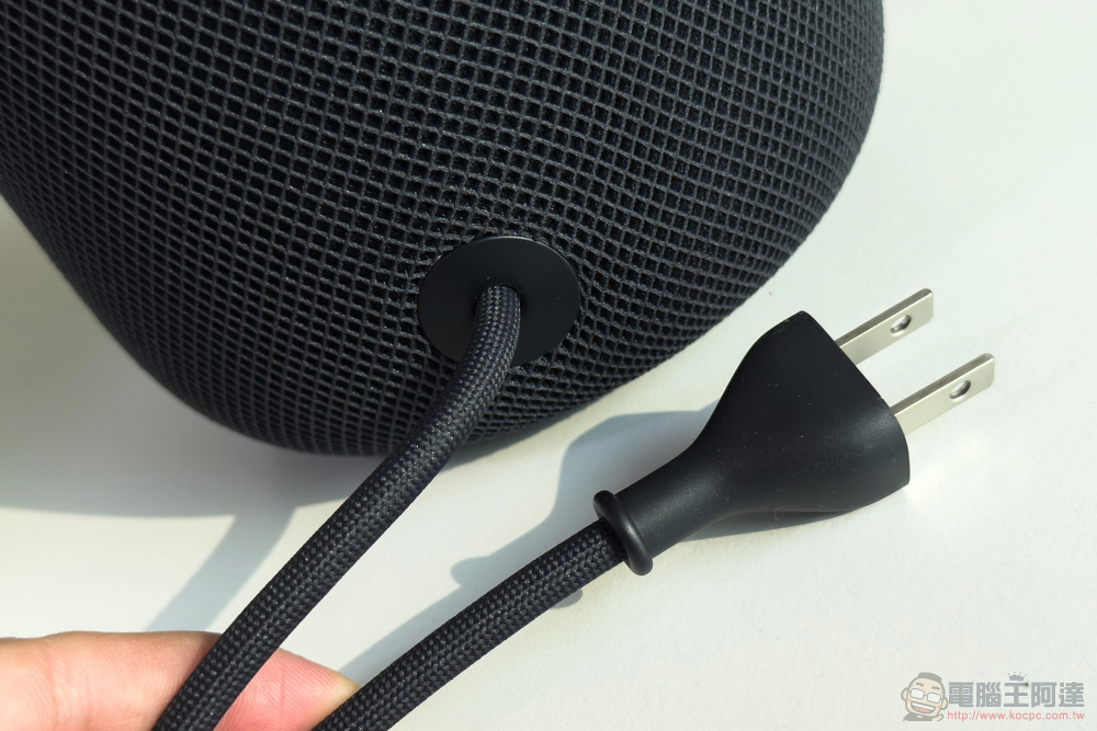 其實看到原廠線這樣的設計,會讓人覺得應該會是特規的電源線。不過在半信半疑之下,筆者直接拿著一般的八字頭電源線插進 HomePod 2。想說一時半刻沒什麼反應看來是不能用,結果它就直接亮了起來 XD。