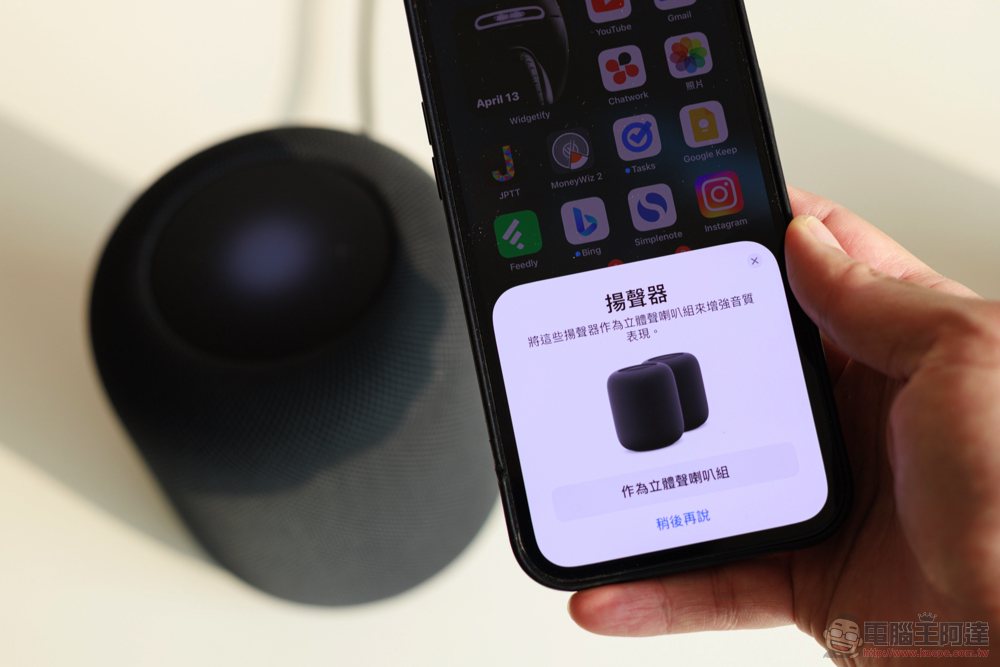 就個人印象這應該是後續才新增的更簡易立體聲配對體驗(之前好像要手動到家庭 app 另行以「建立立體聲喇叭組」設定)。不得不說,這種使用體驗真的很直覺(比讚)。