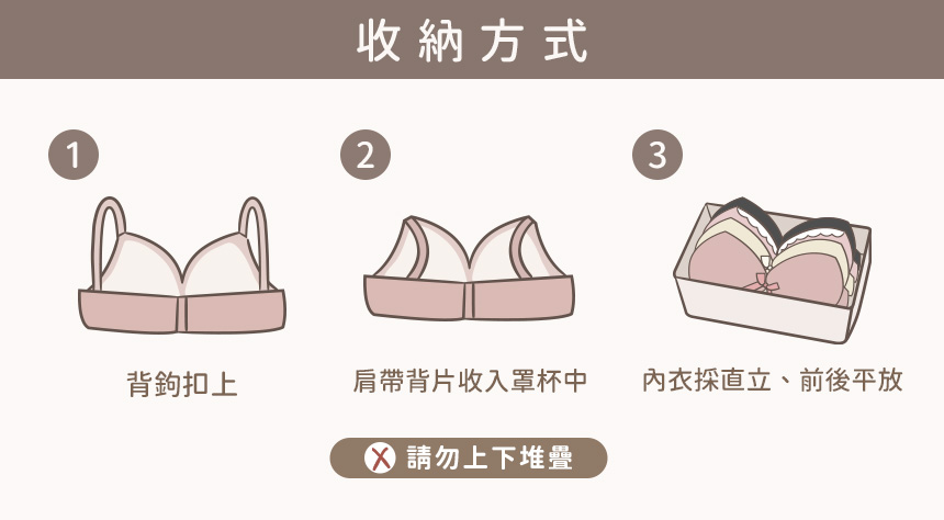 ※ 請勿上下疊放,內衣本身是有重量,容易使壓在下方的內衣變形。