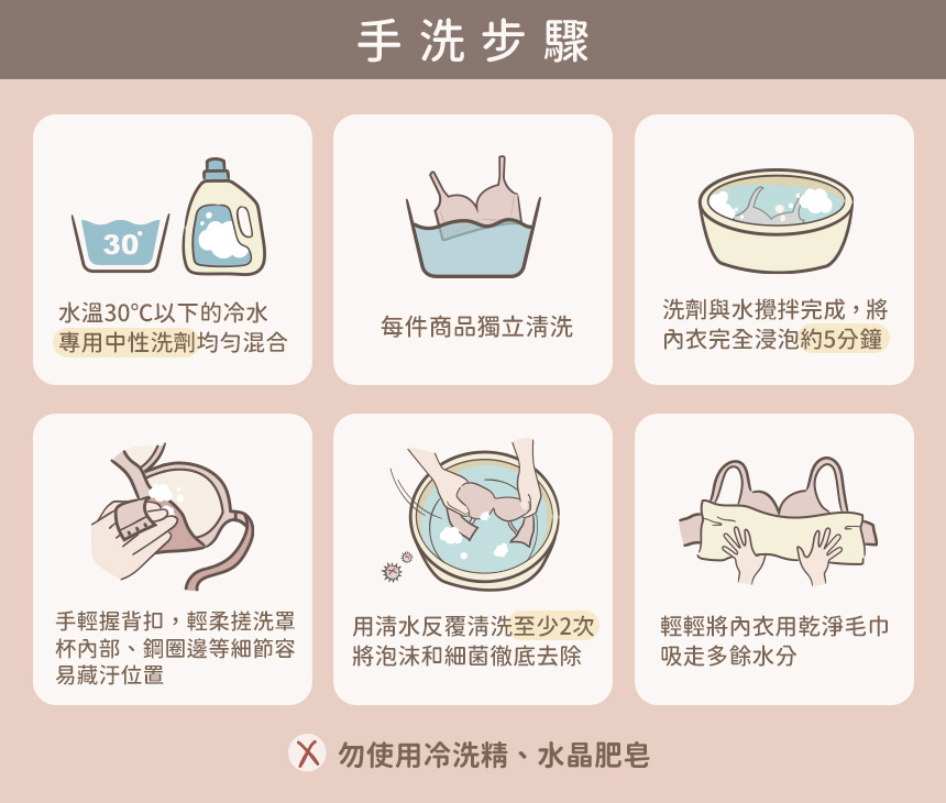 ※ 請勿使用:冷洗精、傳統水晶肥皂,強性清潔劑會影響內衣材質,甚至會造成顏色褪色。