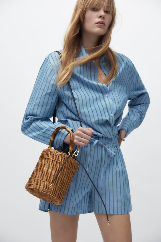 造型優雅古典的藍型包,適合不需要太多東西出門的晚餐約會,竹製的提把還有深淺的色澤,內裡的黑布副有收縮抽繩,不怕裡面的東西被看光光,這款籃型包就算搭小洋裝也很合適喔~