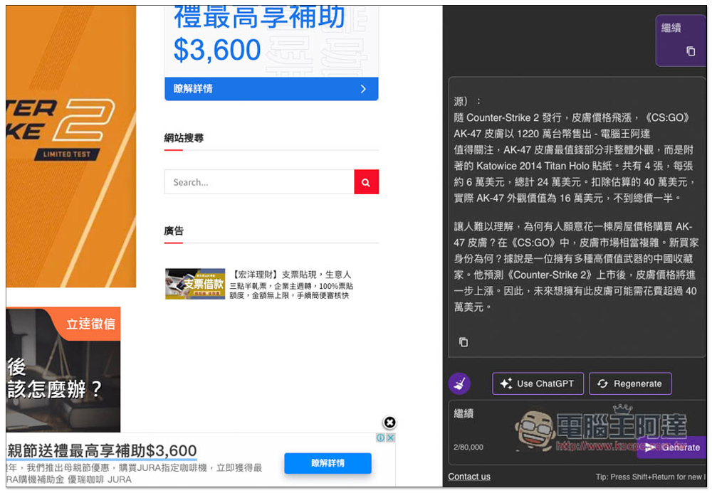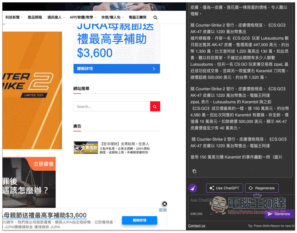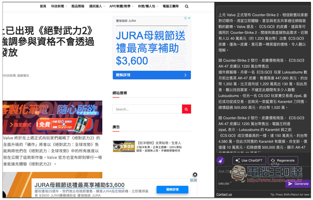 應該很多人跟我一樣,每天都會用 ChatGPT 來處理工作、生活上的大小事務,像是翻譯國外文章、快速獲得總結、創意靈感、各種問題等等,而要用 ChatGPT 時,就必須一直切換視窗,說實在使用上多少都會覺得不便,而最近就發現到這款相當不錯的「UseChatGPT.AI: ChatGPT Copilot on Chrome」擴充功能,安裝之後只需要按下鍵盤快捷鍵,就能在當前網頁的側邊開啟 ChatGPT 聊天視窗,讓我們可以直接跟 ChatGPT 詢問,非常方便,而且每一個對話訊息都有一鍵複製功能,也能選擇要用的模型,包括 GPT-4,並內建超多實用指令,如:摘要、重寫、翻譯、縮短內容、檢查拼音和文法等等,完全免費。