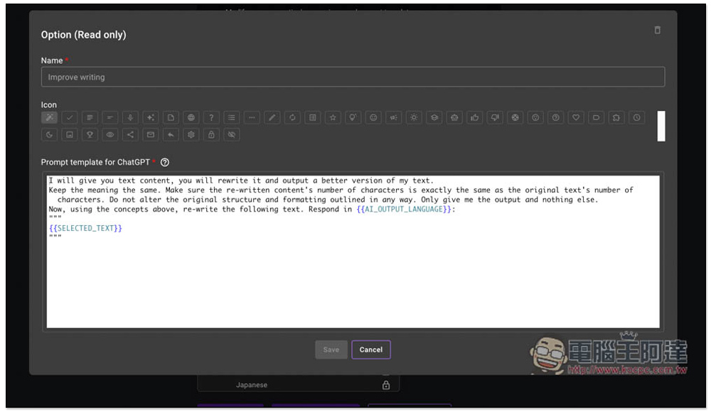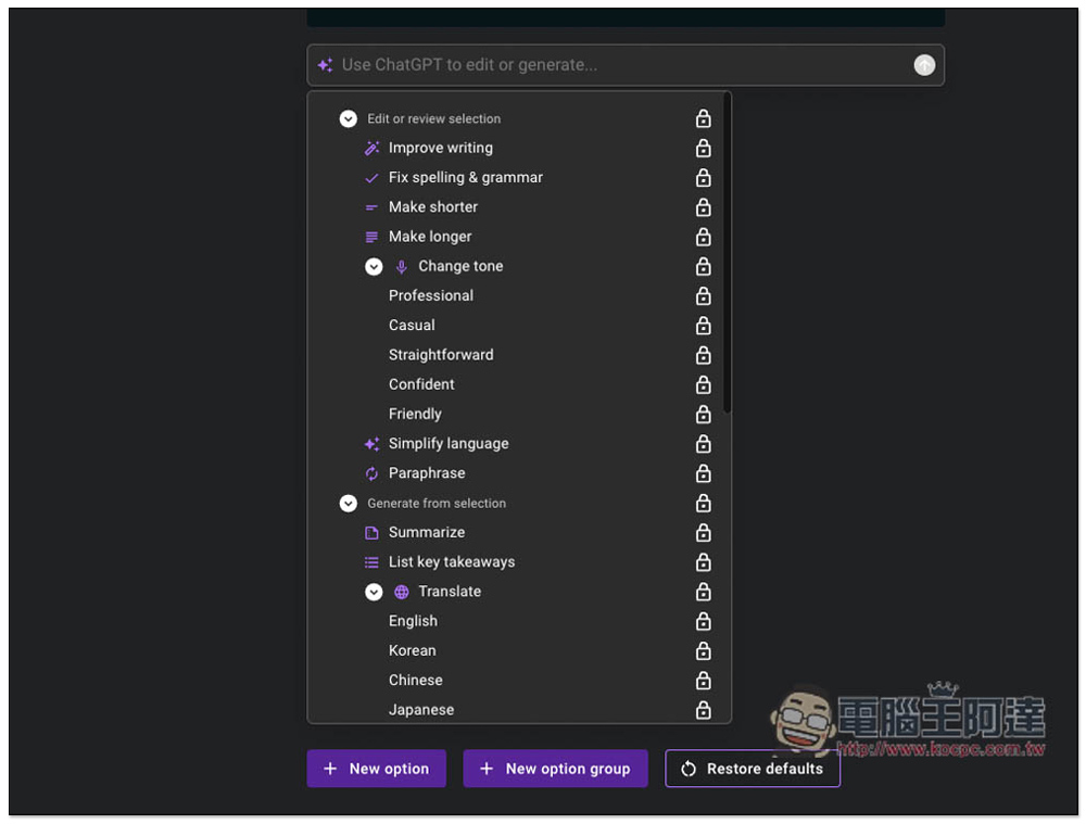 最下面這個還蠻值得仔細看一下的,這邊都是內建好的 prompt 指令,有提升寫作、修正拼寫和文法、把內容變短、把內容變長、改變語氣(專業、休閒、自信、友善等等)、摘要、列表、翻譯(英文、韓文、中文等等),每一個都非常實用,你甚至還能加入自己的指令:
