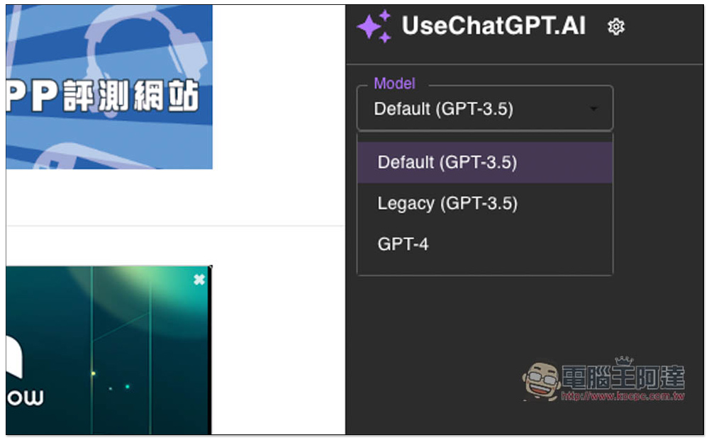 聊天室最左上角可以切換你要使用的模型,預設為 Default(GPT-3.5),如果你跟我一樣是 ChatGPT Plus 用戶,那就可以選擇 GPT-4:
