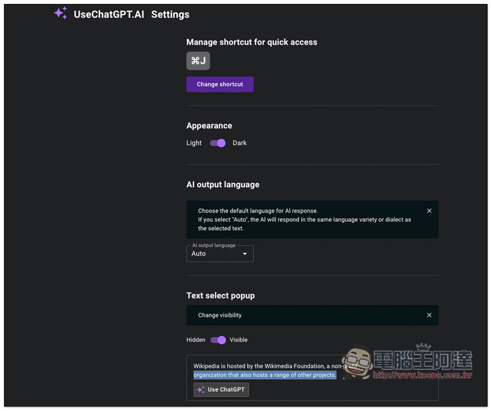 另外在設定選單中,還有不少功能可以調整,AI output Language 預設為 Auto,建議可以先設定好繁體中文,要不然有可能偶爾會獲得簡體中文的回答。快捷鍵也能自己設置,如果你用不習慣: