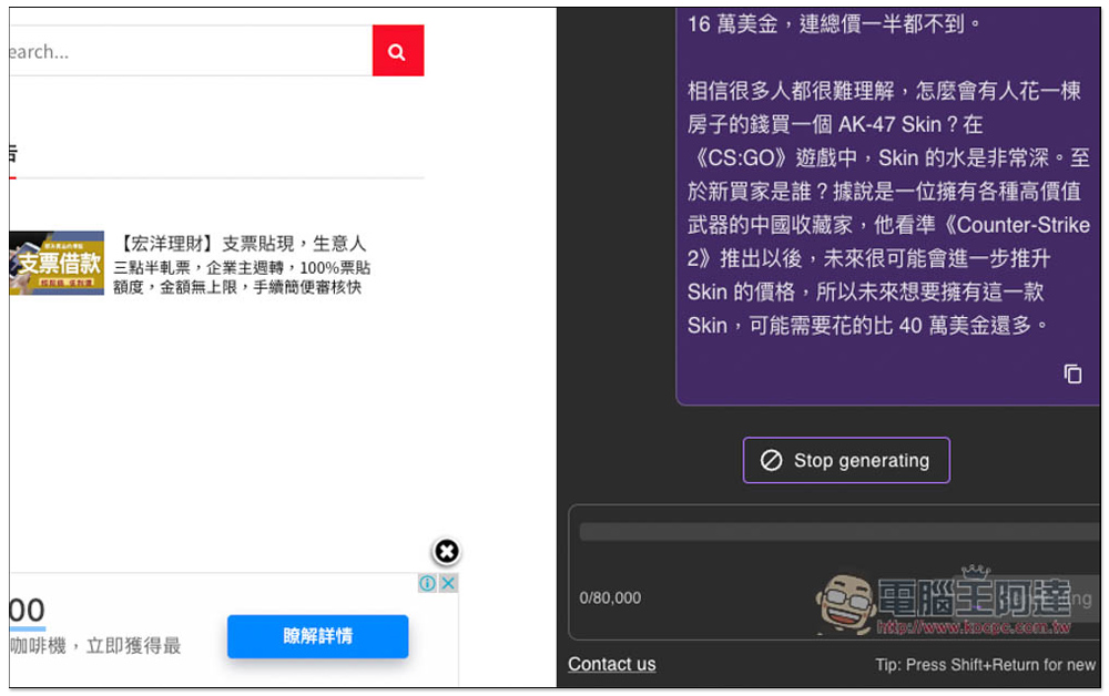 就跟 ChatGPT 網頁版一樣,如果內容太長,還是會發生回覆到一半停止的情況,這時就需要輸入 "繼續":