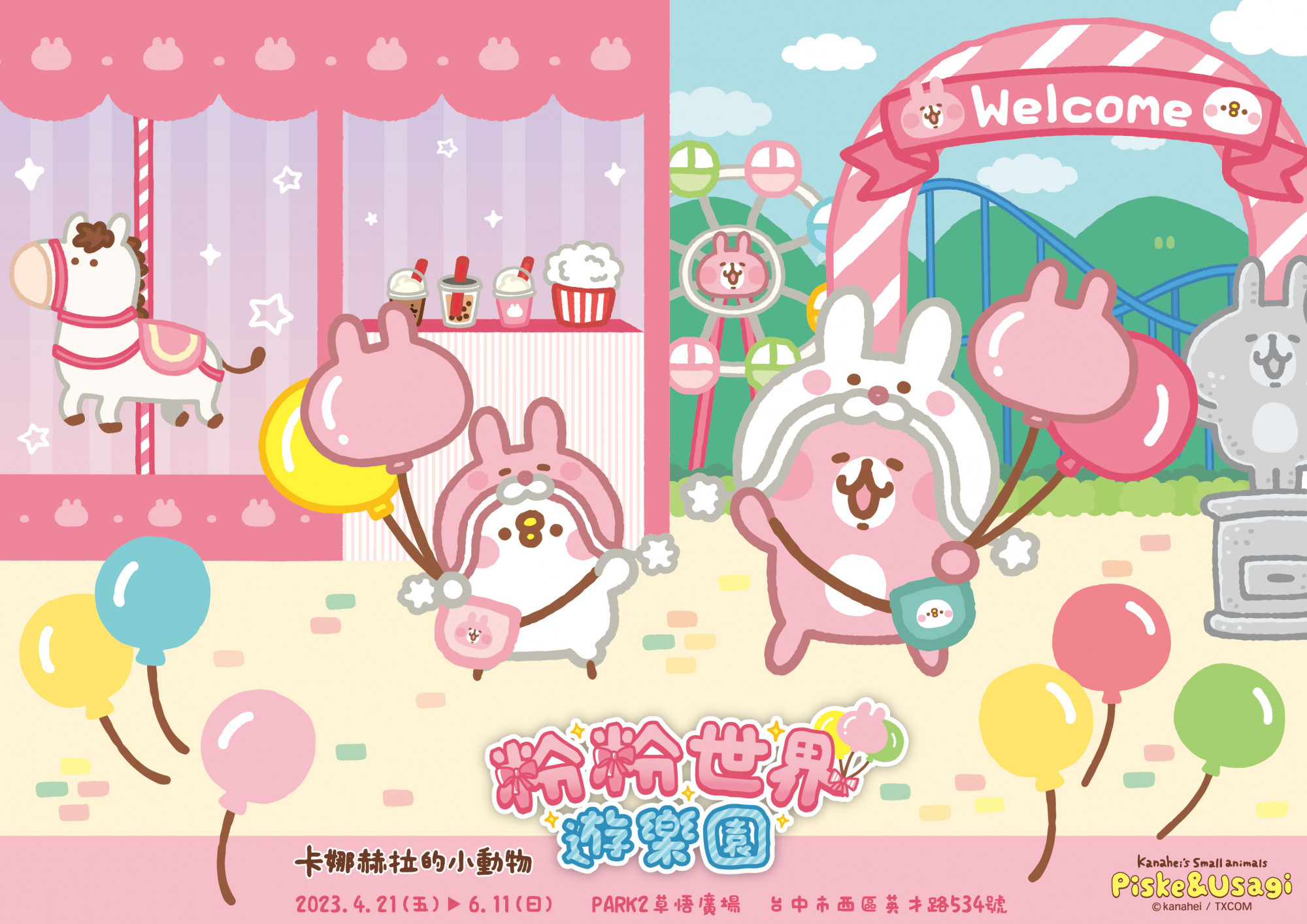 台中的朋友們久等啦!超Q超萌的《卡娜赫拉的小動物-粉粉世界遊樂園》將於4/21-6/11現身台中PARK2草悟廣場(尖叫)現場將有八大夢幻打卡點,包含12米長「粉粉世界遊樂園」、「直衝雲端雲霄飛車」、「立體旋轉木馬」等拍照牆,還有超過50款限定周邊等你來收藏!