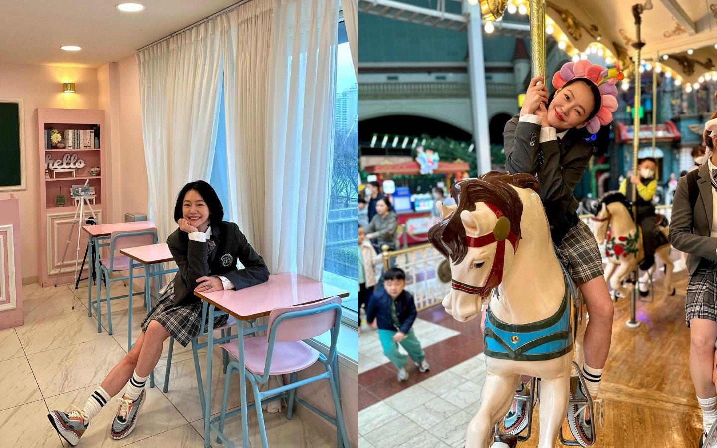 除了餐餐滿足味蕾之外,這趟旅程中小S更換上韓式校服,在「樂天世界」裡乘坐海盜船放聲尖叫,那凍齡的模樣簡直就與女高中生無異!