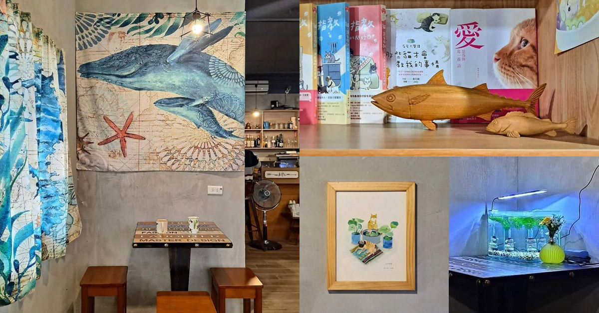 推開門走進,一目瞭然的動線,沒有花俏的佈置或擺設,沉穩的灰色調與些許木製建材的呼應教人放鬆。而牆上也懸掛了幾幅印有海龜、鯨魚或海馬...等海洋生物圖案的布簾,在吧檯側邊,還養著小型玻璃水族箱,可愛小魚悠游其中,我想...闆娘取為「魚咖啡」店名之意,或許也是由此而來吧(?)