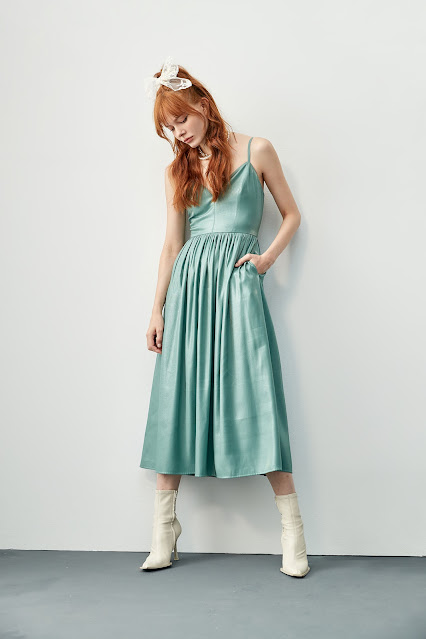 這款洋裝最吸引人的莫過於那獨特的湖水綠光澤面料,搭配上貝殼領與切腰設計,穿上便宛若化身森林中的精靈仙子,散發優雅空靈的氣質。其下半部有做出立體皺褶感,垂墜線條完美修飾腿部曲線,拉長身體比例。想自信展現好身材,選這一款就對了!