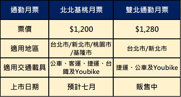 預計七月推出每月1,200元在北北基桃生活圈月票,30天內可無限次搭乘生活圈內公車、客運、捷運、台鐵及公共自行車等運具。與現行$1200雙北通勤月票相比,除了票價少了$80,生活圈擴大到基隆市與桃園市,通勤運具多了台鐵與公路客運。