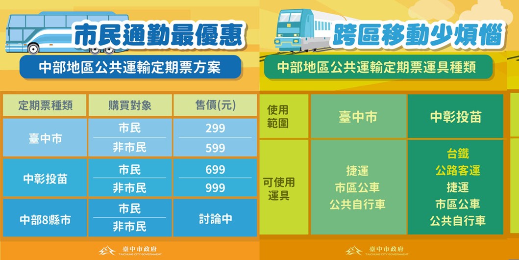 台中市推出台中市市內通勤通學月票(台中市民299元、非台中市民599元),以及中彰投月票(台中市民699元、非台中市民999元)。其中,台中市民限定的299元通勤月票方案預計七月將擴大使用範圍到台鐵。