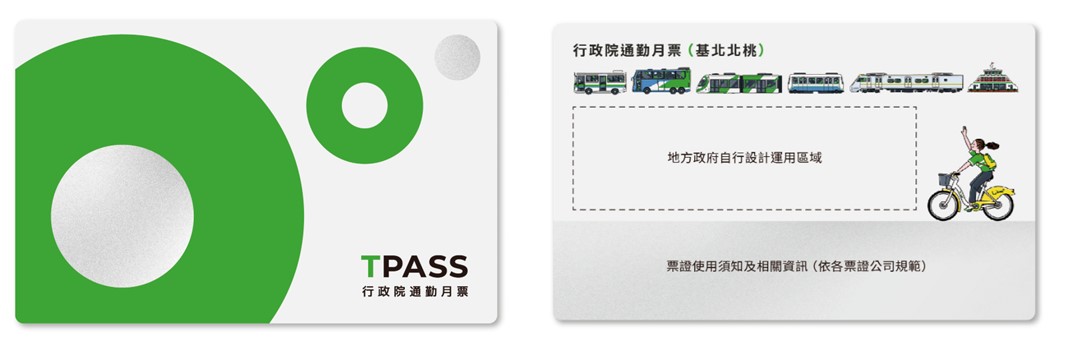 票卡正面為全國統一版面,「T」代表台灣(Taiwan)交通運輸(Transport),也傳達共好 (Together)、行遊 (Tour) 與信賴 (Trust)等理念;背面設計為7種通勤運具及年輕人騎乘公共自行車插畫,帶出多樣運輸組合。另外,正圓圈圖形顏色及部分區域彈性供各縣市設計,以利不同區域月票識別。「TPASS行政院通勤月票」將與國內三大票證公司悠遊卡、一卡通及愛金卡合作,製卡費用由中央全額補助,每人可享一次免費領取,需配合票證公司進行實名制登記,若遺失可進行掛失,但若二次購買就需自付100元製卡費。
