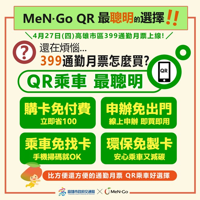 高雄市市區399通勤月票,4/27起正式開賣,原本MeNGo月票由1250元降價為399元,可搭公車、渡輪、捷運、輕軌、YouBike均可「吃到飽」。