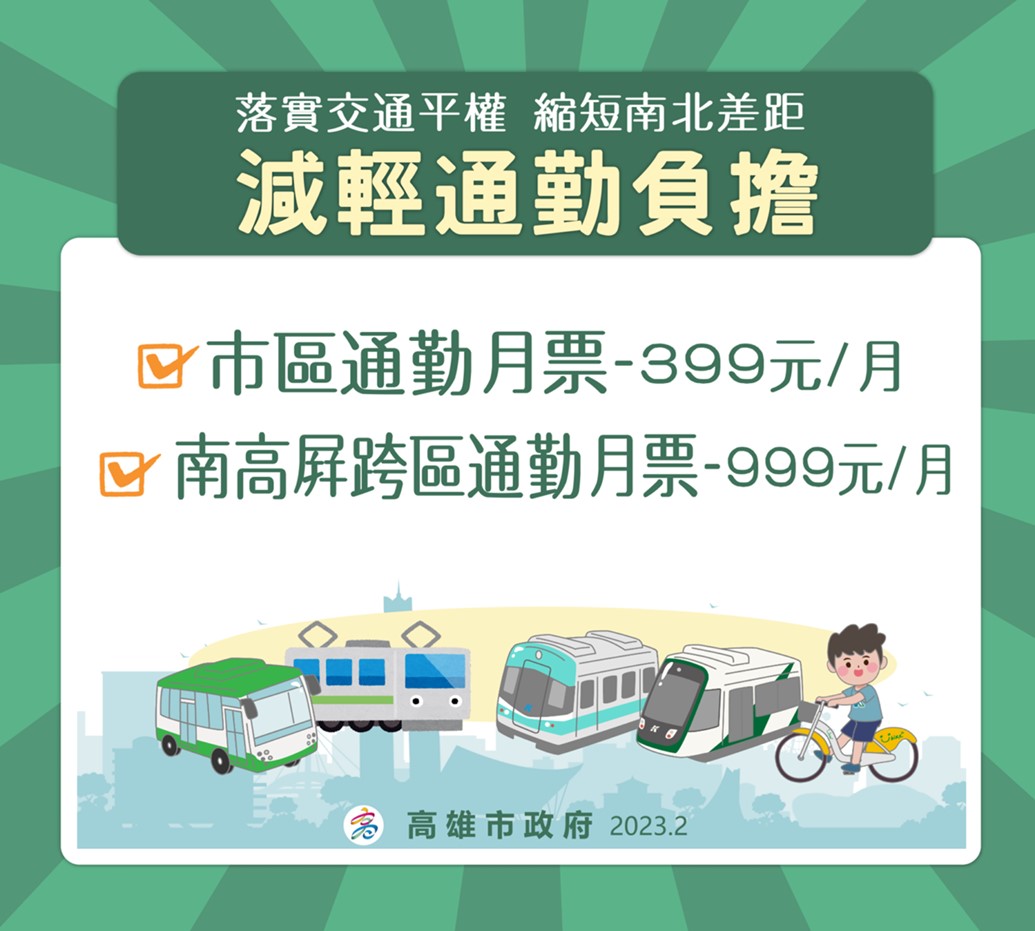預計七月將推出每月999元南高屏城際通勤月票,使用範圍將涵蓋高雄捷運、公車、輕軌、渡輪、台南公車、屏東公車、台南屏東區域內公路含國道客運、台南屏東區間臺鐵及高南屏區域內公共自行車,造福廣大的高南屏都會區通勤通學民眾。