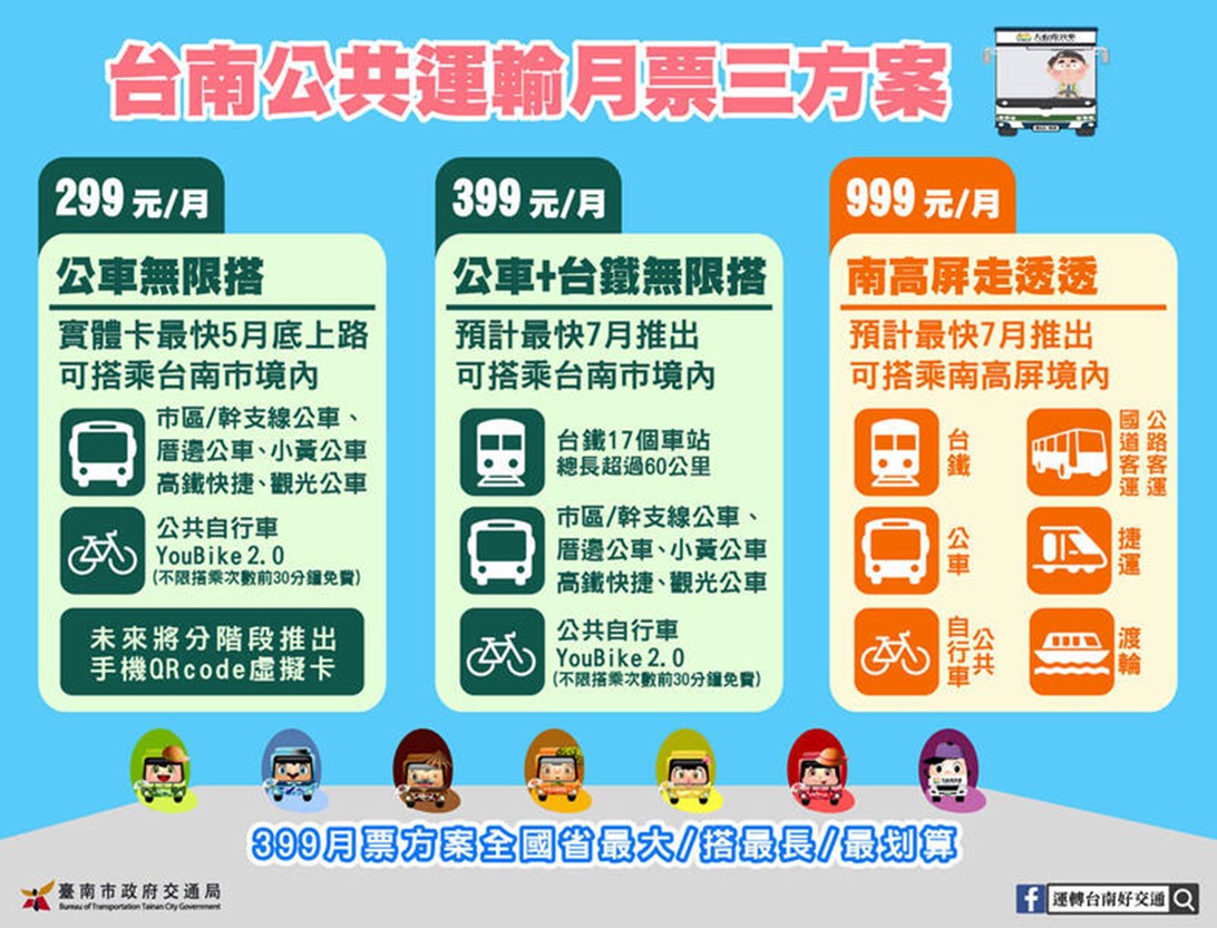「大台南公車無限搭299」預計5月先上路,可以市內公車與公共自行車 每月$299「吃到飽」。 「公車+台鐵無限搭399」方案,就能無限次搭乘境內台鐵,則預計7月上路; 與高雄、屏東跨區的「南高屏公共運輸走透透999」, 也預計七月上路。
