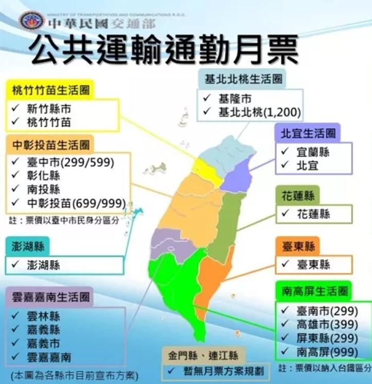 減輕通勤民眾負擔,交通部已擬定「行政院促進公共運輸使用方案」及相關補助規定,將補助全國推動生活圈或單一縣市公共運輸通勤月票措施,在北中南生活圈或各縣市推出「TPASS行政院通勤月票」。其中,高雄市$399市內通勤月票已經於4/27日開賣,北中南三大生活圈通勤月票預計於7月上路實施,其餘生活圈及縣市方案預計8至10月上路, 提供民眾便利及低廉之公共運輸服務。
