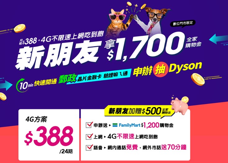 數位門市於5月28日前推出限時快閃優惠,新申辦/攜碼388全速上網吃到飽方案,約期24期,享4G不限速上網吃到飽、網外/市話免費70分鐘,加碼送1,200元全家購物金,符合新朋友資格者再多享500元購物金,總共可帶走1,700元全家購物金。於全家、萊爾富購買SIM卡並使用晶片金融卡/自然人憑證完成數位驗證,還有機會抽中Dyson V10無線吸塵器(市價22,900元)。