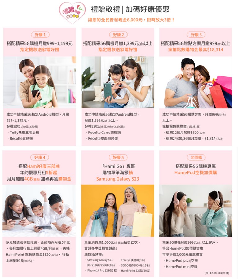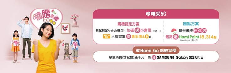 「Hami Go母親節專區」活動期間提供限定優惠好禮,全商品皆能使用Hami Point 1點抵1元,刷中國信託ALL ME卡再享最高13%回饋,申辦「精采5G贈點方案」月繳1,399元(含)以上,加碼贈Hami Point 1,314點,最高享18,314點,點數可於「Hami Go」兌換愛美媽咪必備的Dyson吹風機、高島美足機、家樂福電子禮券等多元商品。活動期間於Hami Go消費滿千元還可參加抽獎,有機會帶走三星Galaxy S23 Ultra、iPhone 14 Pro、tokuyo美腿機、SOGO禮券與Hami Point等好禮。