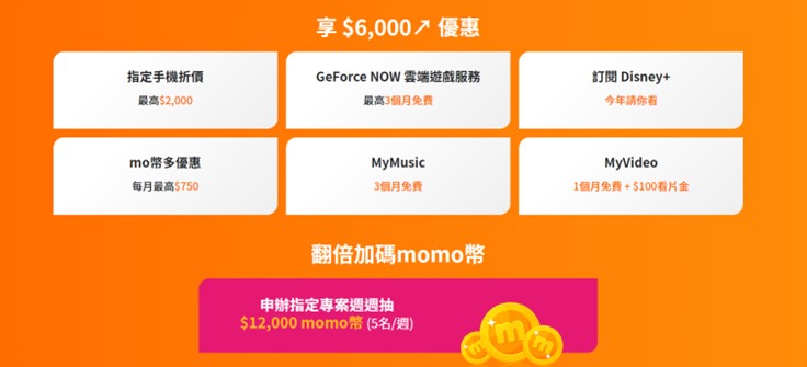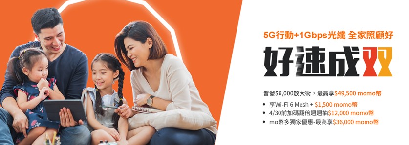 即日起至4月30日,民眾申辦「好速成双」指定專案,月租1,599元享5G行動與1Gbps光纖上網,免費帶走上網神器Mesh Wi-Fi 6與1,500 momo幣,還享MyMusic 3個月、MyVideo豪華月租1個月與加碼看片金、GeForce NOW雲端遊戲服務3個月等免費娛樂體驗!同時,加碼翻倍週週抽momo幣12,000元,還有「mo幣多」消費滿額優惠每月最高享momo幣750元回饋(合約期間最高享36,000元momo幣),最高累計獲得49,500元momo幣,放大政府普發6,000元金額超過8倍!