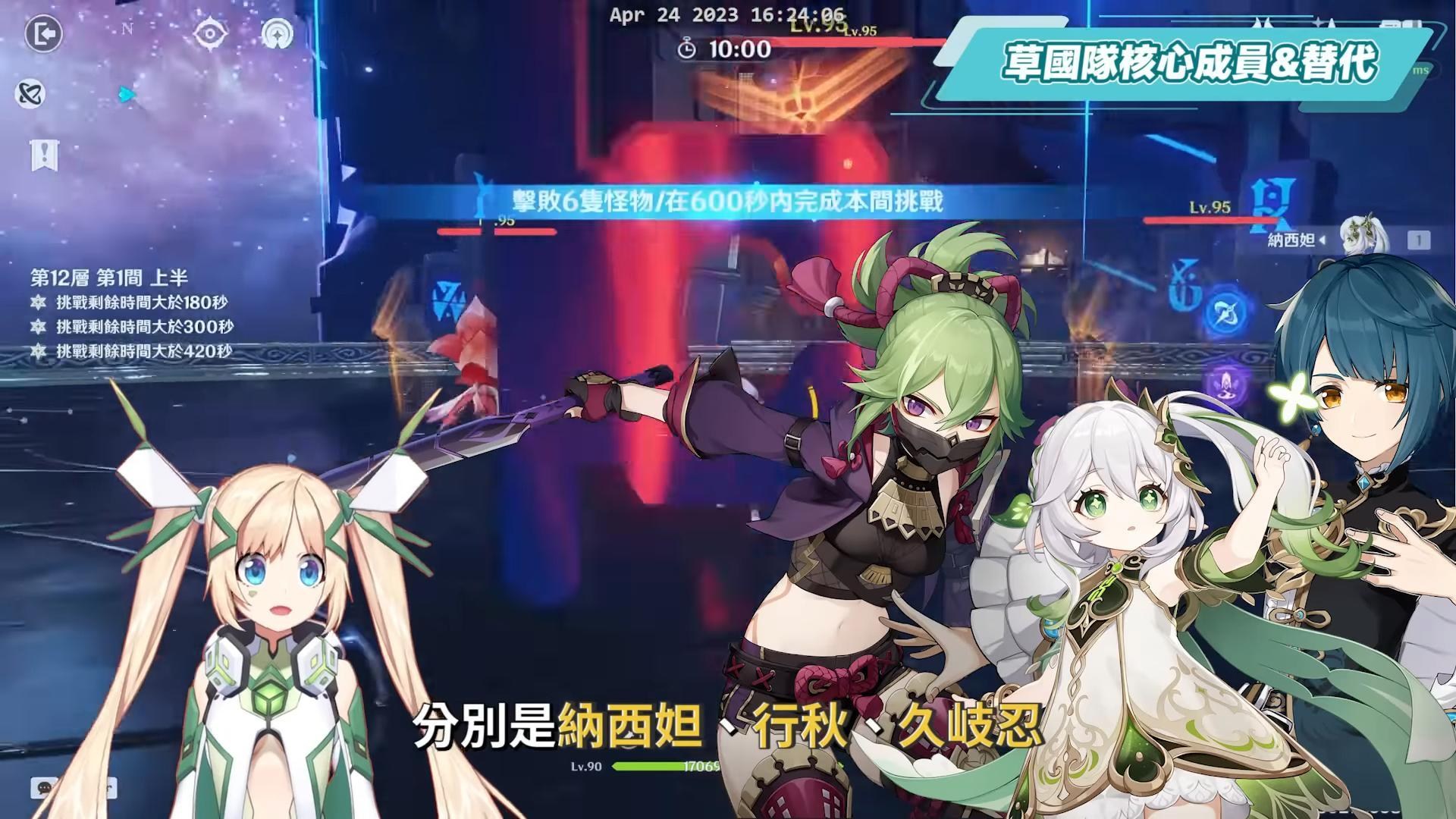 在先前的國家隊成員介紹影片中,主要為班尼特、行秋、香菱與重雲的組合,並且在之後將重雲的位置又替換了萬葉、砂糖與雷電將軍,變成後續熱門的萬葉國家、砂糖國家,以及到現在依然使用率極高的雷神國家隊,那草國隊的成員又是哪些呢?這邊主要會有三名核心成員,分別是納西妲、行秋、久岐忍,也是要玩草國隊的肉肉們要先記得的三個重點人物。這三名角色在場上的同時,可以穩定產生激化、蔓激化、超激化、綻放、超綻放、感電等多種反應傷害,同時超綻放的種子會自動鎖敵攻擊,草神的蘊種印可以一次掃描多名敵人鎖定,能對單又能對群,又因為以劇變反應為主,因此元素精通這項數值也相對重要。草國隊除了比較難應付高草抗的敵人,像是翠翎恐蕈、需要岩元素破弱點機制的黃金王獸、或是會吸收草元素提升抗性的遺跡龍獸,大致上的深淵陣容都算能過,但也因為草國隊還有第四個位置可以靈活變換,因此只要前面的「納行久」傷害夠,例如遇到翠翎恐蕈就帶水或雷的高傷主C、黃金王獸就帶一個凝光、遺跡龍獸可以帶遠程弓箭角破弱點使其癱瘓等,因此也等同於是納行久帶狗的玩法了。