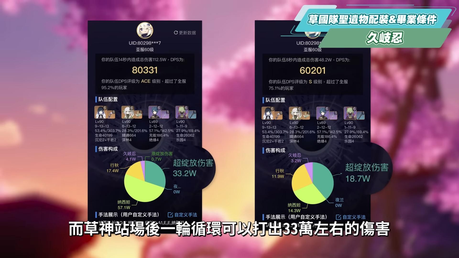 久岐忍在須彌版本後的聖遺物套裝就開始新增了第二種劇變反應的套裝配法,主要是因為草元素的加入後,在超綻放的這個隊伍中,久岐忍需要擔任後手觸發草原核爆炸的位置,而久岐忍元素精通越高,草原核超綻放的傷害也會越高,搭配納西妲開大後的元素精通提升,還能再增加更多傷害,因此久岐忍的培養重點主要就是元素精通能堆多高就堆多高,角色等級升滿90等即可,在目前版本中最適合久岐忍的畢業套裝就是樂園4件套,時之沙、空之杯、禮之冠全精通,副屬性則可以選擇生命值、元素充能、元素精通相關的效果,樂園4件套的套裝效果提供精通之外還能增加綻放傷害,沒有樂園4件的替代方案就是2+2精通套(樂園/流浪/飾金),若是真的連2件套也湊不了,就先穿主屬性全部都是元素精通的聖遺物,能堆多高就堆多高,後面再慢慢換,因此其實養成上真的不會太難,武器方面也是選擇元素精通向的武器,像是鍛造武器鐵鋒刺,璃月NPC對話免費拿的絕版單手劍暗鐵劍、活動限定武器東花坊時雨等都可以,奢華一點也可以拿蒼古自由之誓,或是西福斯的月光,練成形後的久岐忍元素精通大約會落在800~1000。奶量的部分若是擔心回復不夠可以把E技能升高一點,但基本上就算全精通的久岐忍,在搭配行秋的情況下的回復量也是很夠的,加上搭配固有天賦「安心之所」還能基於元素精通提高治療量,可以說是又能奶又能低成本打出高劇變反應傷害的奶媽,而雖然久岐忍可能自身沒有什麼傷害,但是搭配超綻放的效果後,超綻放的占比在一般搭配非滿命的草神情況下通常是可以佔據到將近快一半的輸出佔比,這邊也提供一下圖片給大家參考久岐忍的超綻放傷害,在還沒有草神站場前就已經有18.7萬的傷害,而草神站場後一輪循環可以打出33萬左右的傷害,因此久岐忍雖然好培養,但也不要精通達標後就不往畢業套裝邁進囉。