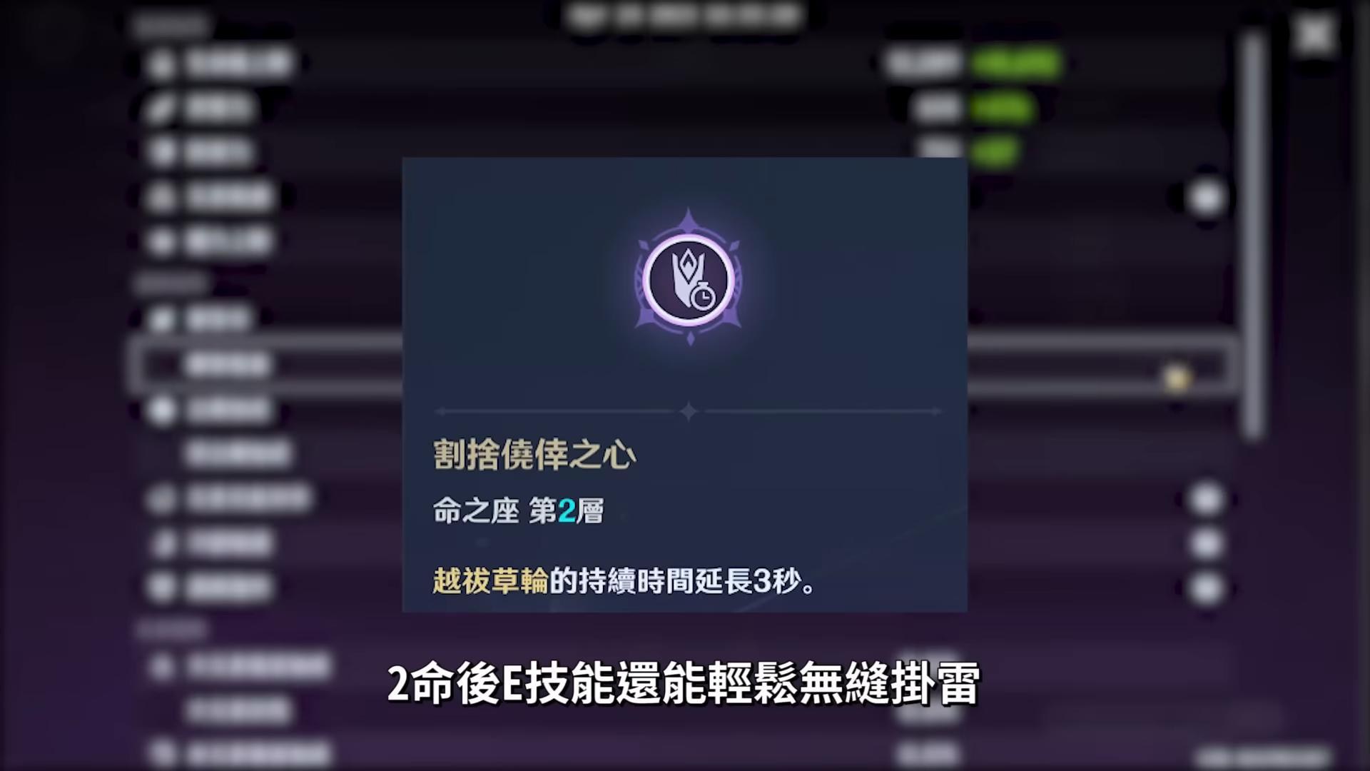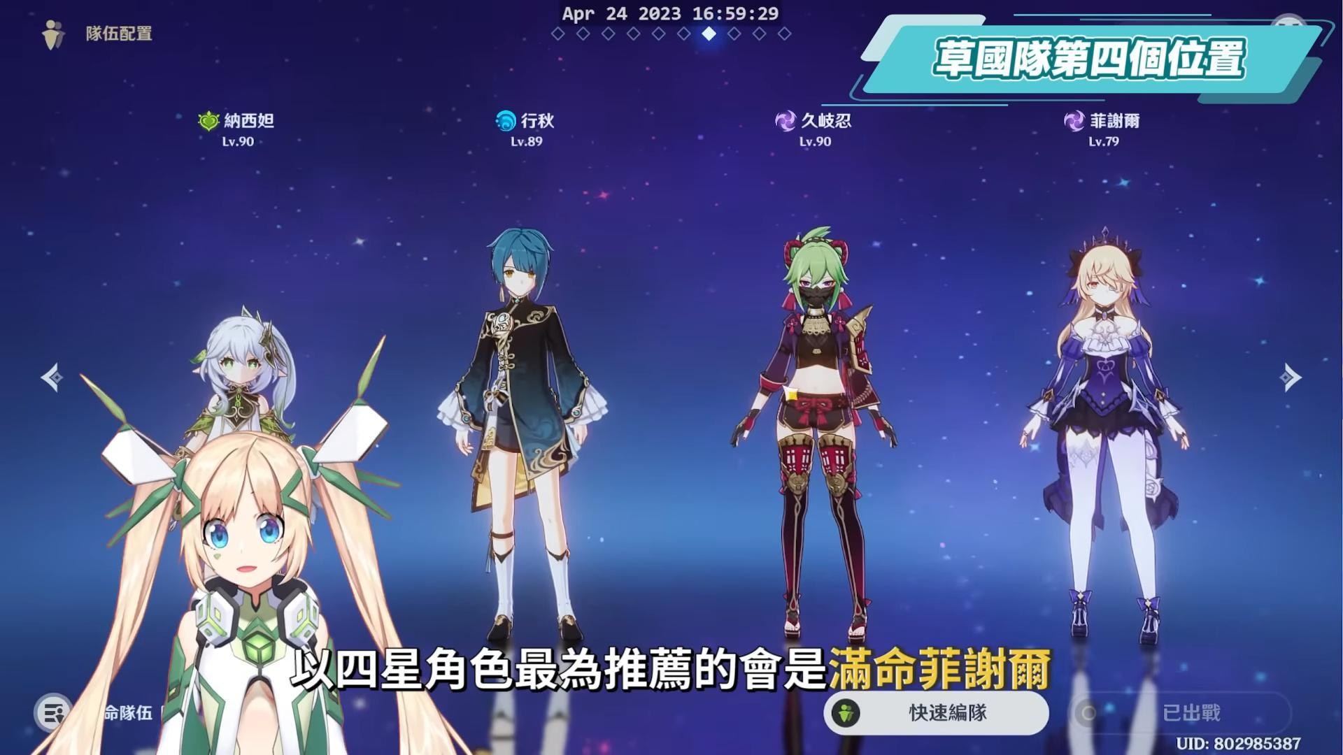 而以輸出向的第四人位置的話,像是水、草、雷的主C都可以,水元素像是綾人、滿命公子、滿命夜蘭、雷元素像是賽諾、2命以上雷電將軍、刻晴、草元素像是艾爾海森、提納里,又或是不干擾草元素反應的冰元素、風元素、岩元素、物理傷害型角色都行,會干擾的主要只有火元素,因此火元素角色就盡量不要放入草國隊,就算新手時期若只有雷澤,搭配草國武裝也是可以探索得很舒適,所以真的可以說是非常適合萌新入坑的一個版本,幾乎等於除了火元素以外的角色都能喝湯的意思。