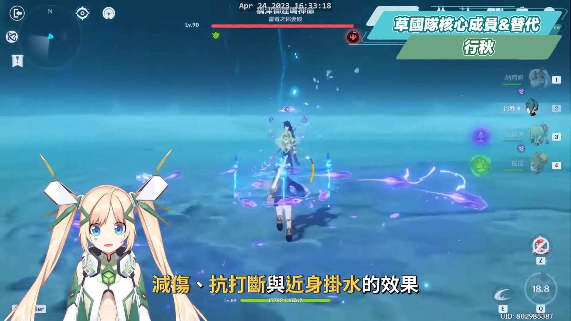 而行秋則是可以提供後台的高頻率掛水,同時透過E技能雨簾劍還能提供站場角色減傷、抗打斷與近身掛水的效果,搭配納西妲的掛草可以快速產生草原核,並保護場上站場的角色,若是要替換的話會需要有2命以上夜蘭才會有相等的水平,變成久岐忍的治療量要負擔稍微多的生存壓力,因此通常夜蘭會拿去置換雷神國家隊的行秋,或是拿去其他的隊伍中做更有效益的利用。而前期萌新若是沒有行秋或夜蘭也可以考慮先用芭芭拉,但就比較偏向過渡期使用,傷害量會少一塊,而且有時還會被內鬼,並少去減傷與抗打斷的效果,站場的角色就會變得比較脆弱,不過在大世界探索也已經十分夠用了。久岐忍